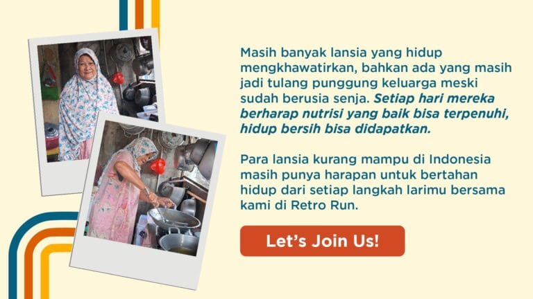 Hi Runners! Tak hanya berlari, Retro Run juga membawa misi kemanusiaan untuk memberdayakan lansia-lansia kurang mampu agar bisa bertahan hidup dari setiap langkah larimu.