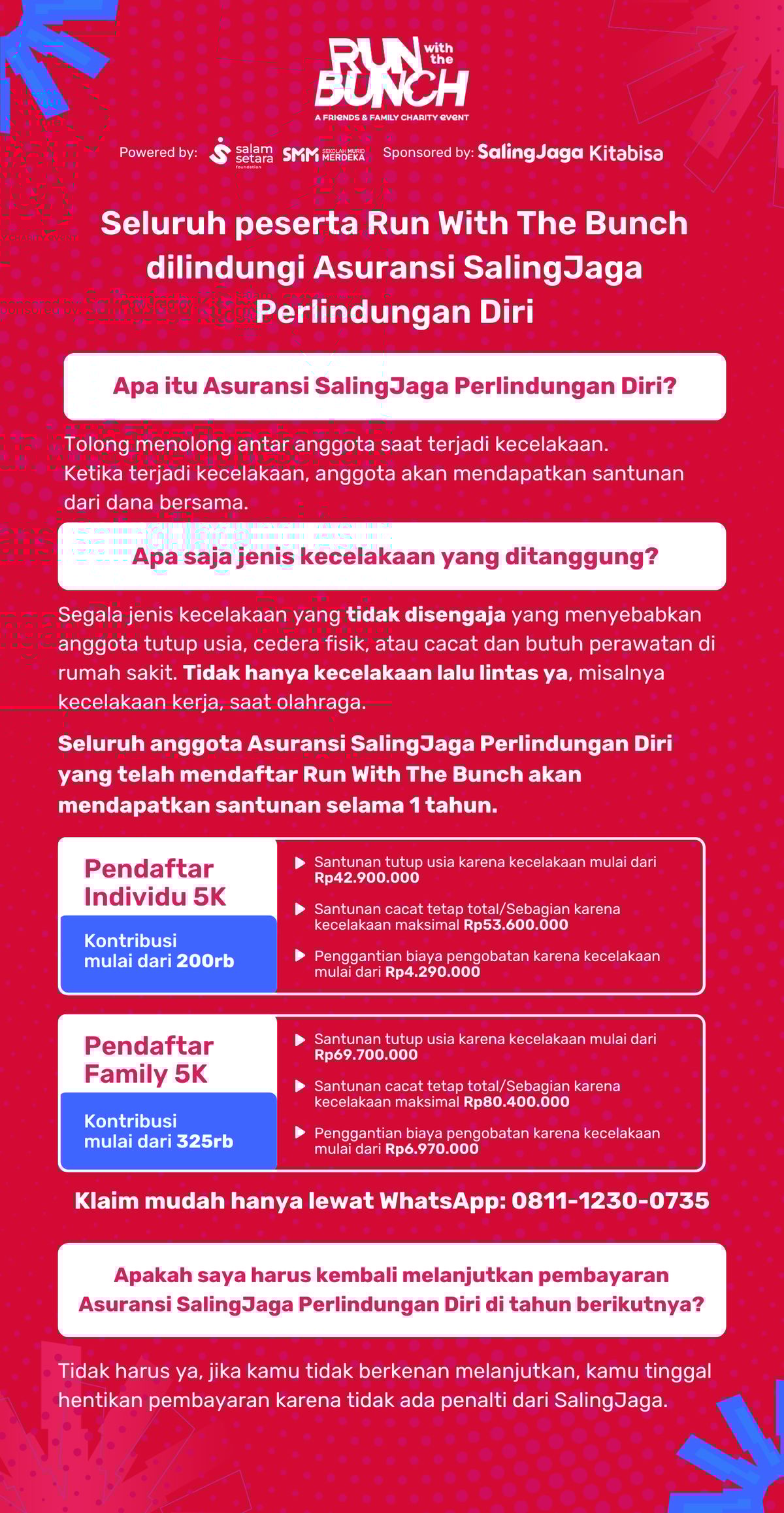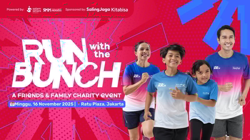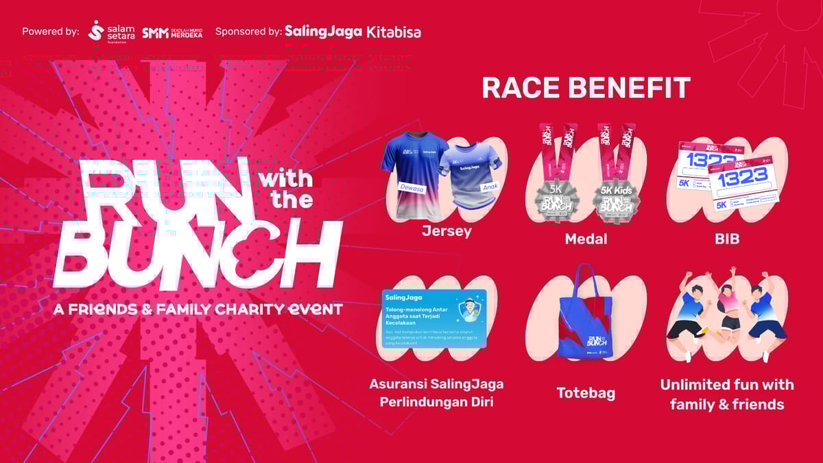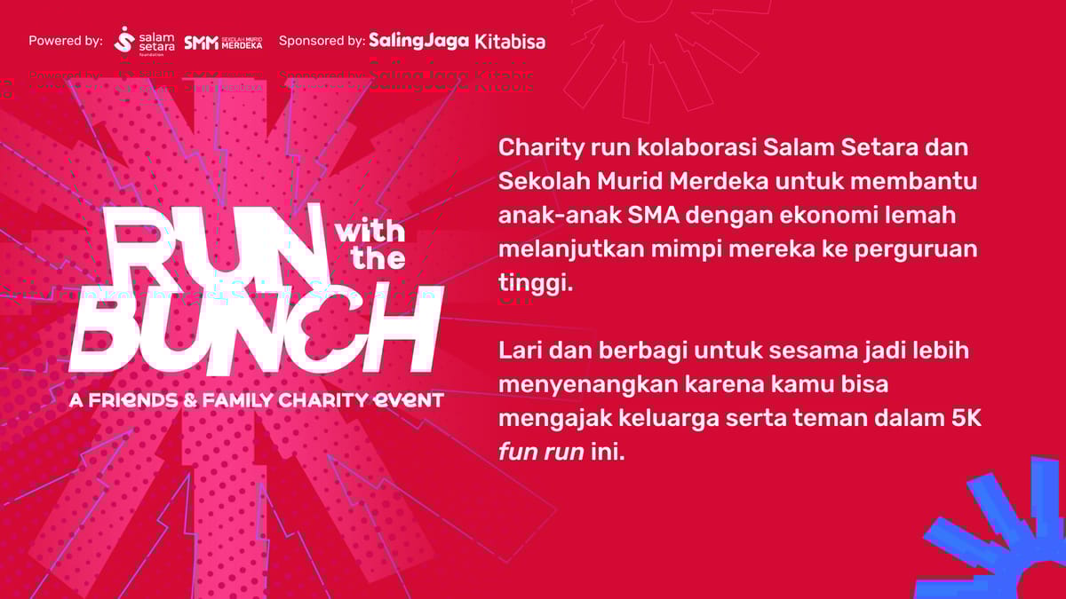 Kamu pelari kalcer, pemula, FOMO, atau apapun, semua bisa seru-seruan lari bareng di RUN WITH THE BUNCH!!! Pada 5K fun run hasil kolaborasi Salam Setara dan Sekolah Murid Merdeka ini, kamu tidak hanya berlari tapi juga berkontribusi untuk memajukan pendidikan anak-anak Indonesia khususnya murid SMA.