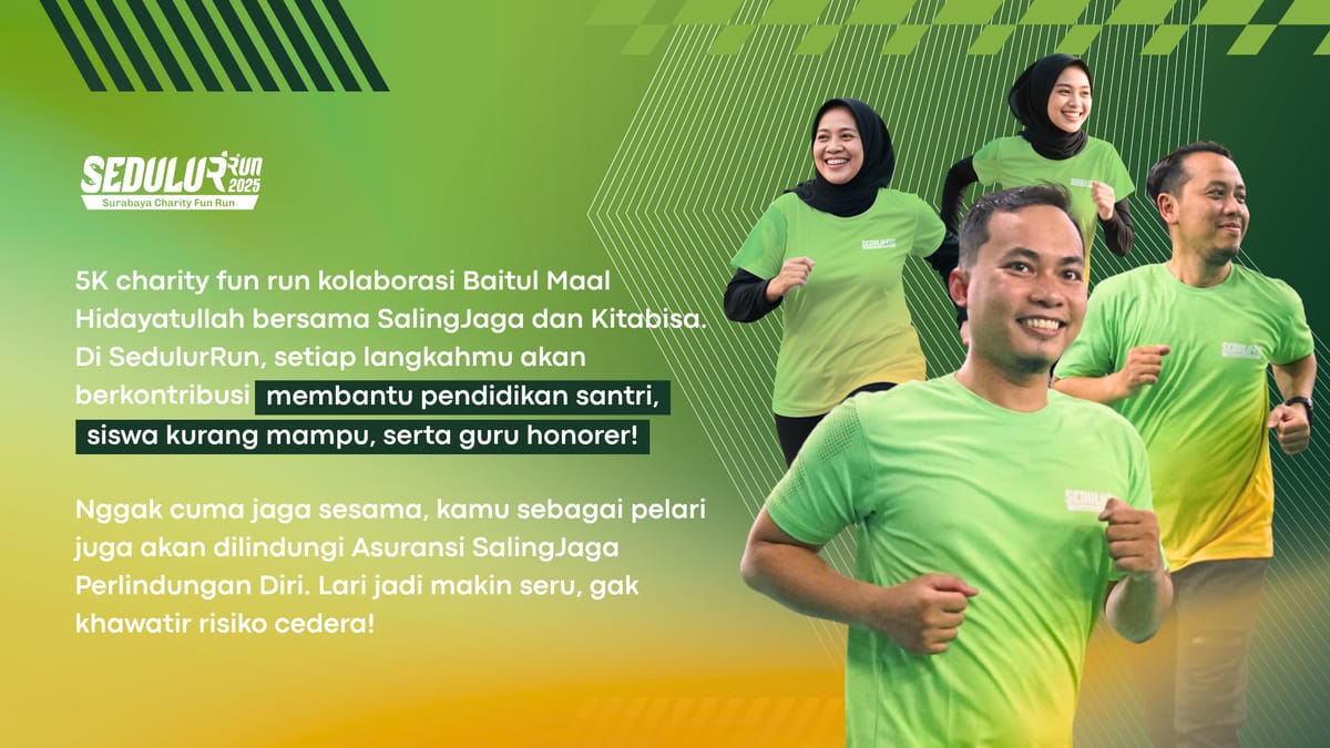 Nggak cuma lari, di SedulurRun setiap langkahmu dikonversikan jadi bantuan pendidikan bagi siswa santri dhuafa serta guru honorer.