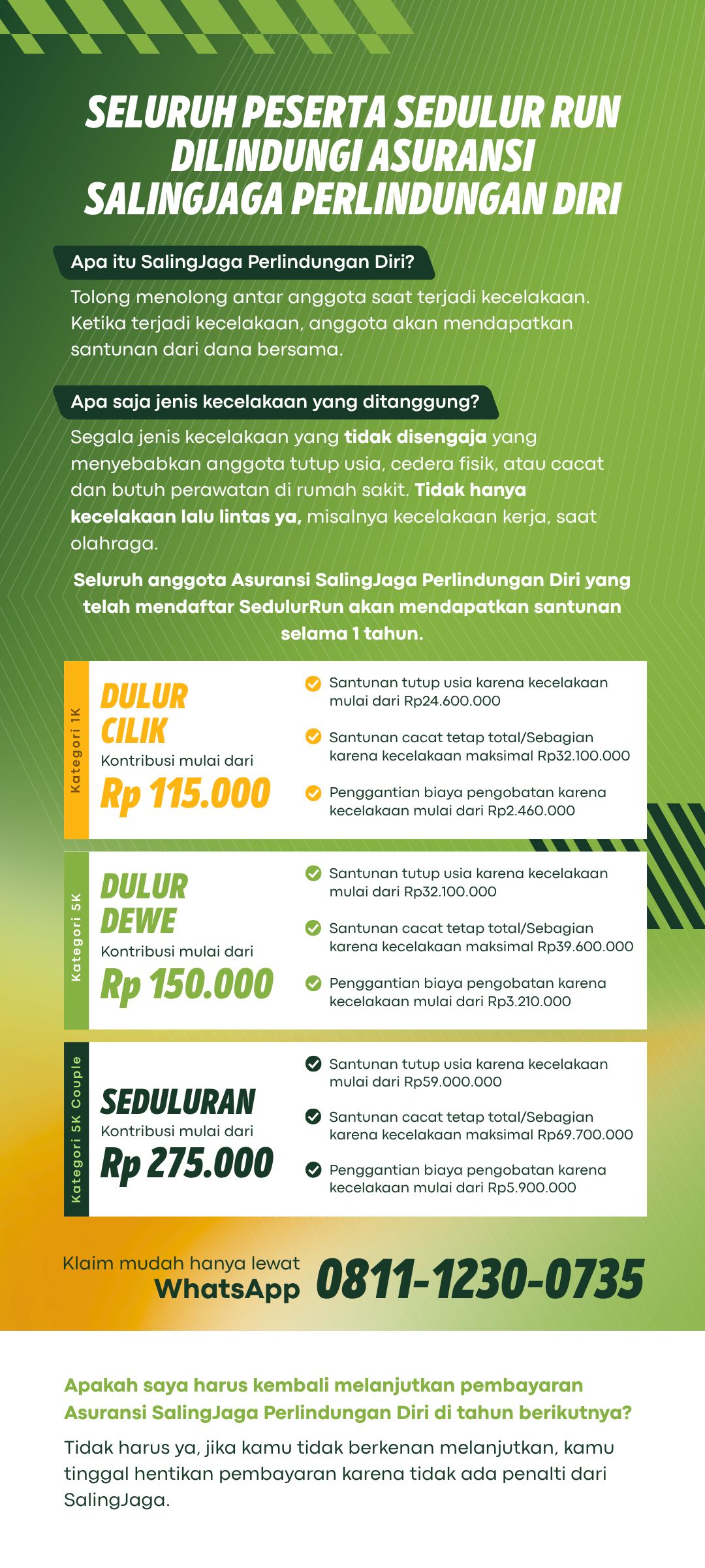Dijamin seru, kamu nggak cuma bantu sesama tapi juga dilindungi Asuransi SalingJaga Perlindungan Diri. Lari aman tanpa khawatir akan risiko cedera & kecelakaan karena setiap peserta telah dilindungi selama 1 tahun!